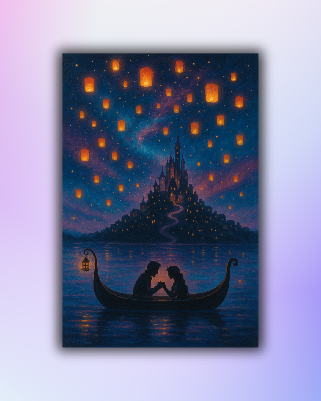 Under a velvet-blue sky lit by drifting lanterns, drift across the water toward a glowing castle and a very “I see the light” moment.